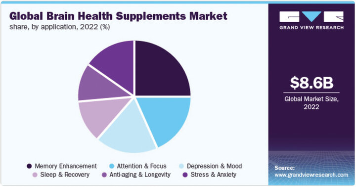 - Grand View Research. Brain health supplements market size, share & trends analysis report by product (natural molecules, herbal extracts, vitamins & minerals), by application (memory enhancement, mood & depression, attention & focus), by region, and segment forecasts, 2023-2030 [Internet]. San Francisco (CA): Grand View Research; c2023 [cited 2025 Jan 10]. Available from: https://www.grandviewresearch.com/industry-analysis/brain-health-supplements-market