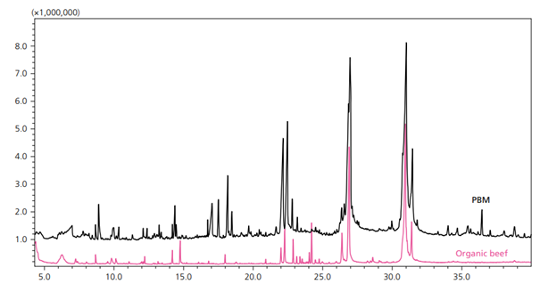 Figure 1. Overlaid Representative Chromatograms for PBM (black) and Organic Beef (pink) (6).