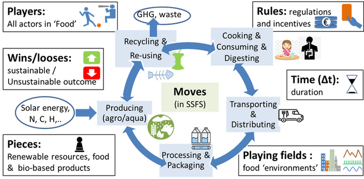 FOODPathS will further explore (a) food system (FS) concepts (see Figure 2) to understand relationships between food actors (‘players’), their food handling activities (moves), used products (‘pieces’), geographic-socio-cultural contexts (‘playing fields’), duration of actions (‘time’), (un-) sustainable outcomes (‘win/loose’), regulations, ambitions, and R&I co-funding options (‘rules’), (b) a Hub of FS(Living) Labs that highlights multi-actor co-creation best practices, (c) an FS Observatory for monitoring sustainability performance of EU FS, and (d) RIPE agendas to align research and innovation, policy and education priorities.
