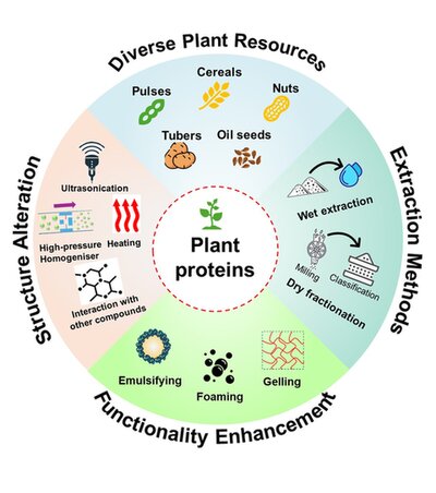 Plant proteins have attracted considerable attention due to their sustainability and health benefits in the past decade, and the global market is expected to reach USD 20.5 billion by 2029 (1). Plant protein bodies are mainly contained within the storage cells of plants, requiring the destruction of the cell walls for extraction purposes (2), which can be classified into four types: albumin, globulin, prolamin, and glutelin (3). Plant protein extraction commonly involves pulses (soy, pea, lupin, fava bean, chickpea), cereals (wheat, rice, oats), nuts (almond, peanut), tuber (potato), and oil seeds (flaxseed). Generally, extraction methods for plant proteins include wet extraction and dry fractionation. Traditional wet extraction (alkaline solubilisation and isoelectric precipitation) can obtain proteins with high purity, but the protein structure will be denatured due to the intensive chemical extraction process (4, 5). In comparison, mild wet extraction preserves the native protein structure and original protein functionality by avoiding harsh extraction processes like isoelectric precipitation, though the purity of the extracted protein is low (4). Other than wet extraction, dry fractionation is solvent-free and can retain the native state of the plant proteins to a large extent (5), while the protein from dry fractionation is mixed with non-protein impurities (>10%) such as starch, fibre, etc (5). The overview of plant protein development is shown in Figure 1. The techno-functional properties of plant proteins (emulsifying, foaming, and gelling capacities) are crucial for their uses in food systems. Some studies have suggested that the functionality of extracted plant proteins can be preserved in their native state (5), while others have pointed out that plant proteins with moderate structural alteration exhibit the potential to achieve better functionality (6). For example, native plant proteins with compact structures can be treated with heating (7), ultrasound (8) , and high-pressure processing (9) to induce partial unfolding and become more flexible, improving protein adsorption at the oil/water interface. Plant proteins can change their secondary structures and improve their usability in food systems by enzymatic treatment (10) or by forming non-covalent or covalent bonds with polysaccharides (11, 12) or polyphenols (13). New focus of plant protein research is more on protein functionality rather than purity. Pea protein concentrates with limited fractionation achieved higher gelling ability and stronger gelling strength than pea protein isolates with high purity due to the difference in the extraction process and the different amounts of sugars and ash content (14). Plant albumins, the side stream from plant globulin extraction, show an excellent foaming capacity, which allows albumins to upgrade from a side stream into valuable foaming agents in food products (4, 15). Moreover, the cooking water of chickpeas (aquafaba) containing albumin, polysaccharides and saponins is a good egg replacement (16). The focus of current plant protein research is to use practical methods to modify protein structure and to improve their functionality. The goal is to develop underutilised plant proteins with improved functionality in food products.
