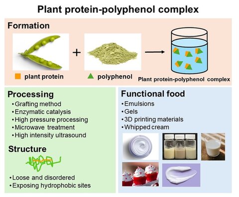 The combination of plant protein and polyphenols holds enormous potential as functional food ingredients with improved emulsifying, foaming, and gelling ability of plant proteins. The fortified antioxidant activity of plant protein-polyphenol complexes has been shown to prevent lipid oxidation, slow down the deterioration of food products, and provide proven therapeutic effects. Improvements in sensorial and nutritional profiles are critical to stimulate their applications in plant-based foods, including as functional beverages, food gels, and 3D printing materials.