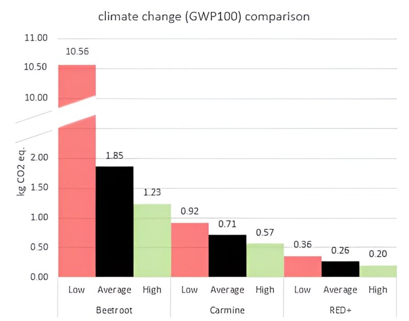 Figure 1. This graph compares the carbon dioxide equivalent emissions (kg CO2 eq.) for three different red colorants: beetroot, carmine, and Michroma’s RED+. The emissions are shown for three scenarios: low, average, and high yield. For this life cycle assessment, the functional unit was defined as the kilograms of each of these colorants needed to take 100 kg of a soft beverage to the same final absorbance of 1 a.u, and the environmental performance in terms of carbon dioxide equivalent emission favors the precision fermentation-based solution in all the scenarios analyzed. These insights are part of an unpublished study that used internal data supported by the OpenLCA database.