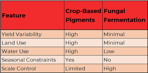 Natural colorants are in high demand, but their supply chains are broken. Crop-based pigments face unpredictable yields, regional sourcing constraints, and volatile pricing, challenges that only intensify as brands push to replace synthetic dyes at scale. Fermentation, particularly through engineered fungi, offers a fundamentally different path: controlled, modular, and decoupled from climate or land use. This article argues that fungal biofactories are not just a technological solution—they represent a paradigm shift in how we produce ingredients. By rethinking colorants as a product of microbial precision fermentation rather than agricultural extraction, and by outperforming legacy natural production methods on yield and consistency, the industry gains a clear path to reliable ingredient supply with significantly lower volatility. Moreover, life cycle assessments indicate that precision fermentation-derived colorants can deliver comparable color intensity with the lowest CO₂-equivalent emissions among major natural alternatives, underscoring their environmental advantage.