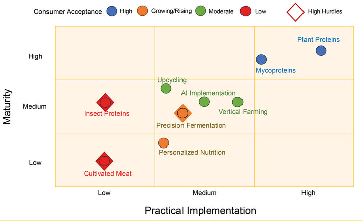 The food technology landscape in the following years is marked by innovation and complexity. Alternative proteins, functional ingredients, precision fermentation, and upcycling offer solutions for public health and sustainability. Digitalization is transforming supply chains, personalization, and transparency. However, challenges persist: reductionism in public discourse, scalability issues, regulatory discrepancies, uneven consumer acceptance, and high costs for new infrastructure. Regulation is both a safeguard and a bottleneck, requiring cohesive industry engagement and transparent dialogue. Personalized nutrition, while promising, introduces new inequalities and trust issues around data use.