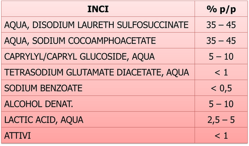 La formula 1 è un buon compromesso in termini di viscosità, spruzzabilità e sensorialità, contenente una combinazione di tensioattivi anionico, anfotero e non ionico e SAL pari a 40. È trasparente, massaggiabile e produce una schiuma gradevole (Formula 1).