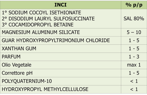 Per ottenere SAL più elevate è necessario ricorrere a formulazioni anidre in polvere, combinando tensioattivi commercializzati in forma solida quali Sodium Methyl Cocoyl (o Oleoyl) Taurate, Sodium Cocoyl Isethionate, Sodium Stearoyl Glutamate, Disodium Lauryl Sulfosuccinate, Cocamidopropyl Betaine, diluiti con ingredienti che hanno funzioni accessorie e non devono peggiorare l’effetto igroscopico dei tensioattivi al contatto con l’acqua. Ad esempio, a livello applicativo l’argilla smectite viscosizzante Magnesium Aluminum Silicate riduce l’effetto “impacco” durante la distribuzione sui capelli, ma causa allo stesso tempo secchezza e prurito allo scalpo in elevate percentuali. La formula 2 si basa su una combinazione di Sodium Cocoyl Isetionate, come tensioattivo anionico principale, Cocamidopropyl Betaine in quantità moderate per limitare l’effetto igroscopico e la formazione di grumi all’aggiunta di acqua e, infine, Disodium Lauryl Sulfosuccinate, che aumenta la quantità e la qualità della schiuma. L’aggiunta di una piccola percentuale di Idrossipropilmetilcellulosa agisce da sostenitore di schiuma e condizionante. Altri condizionanti compatibili con la formula e con un buon effetto sono Polyquaternium-10 e Guar Idrossipropiltrimonio cloruro. È utile utilizzare la coppia Bicarbonato di sodio e Acido citrico come tampone, poiché reagendo con l'acqua creano effervescenza, aumentando la quantità e la qualità delle bolle di schiuma. È preferibile scegliere un profumo concentrato per non dover aggiungere dosi elevate di liquidi che tenderebbero a peggiorare l’impaccamento delle polveri (Formula 2).