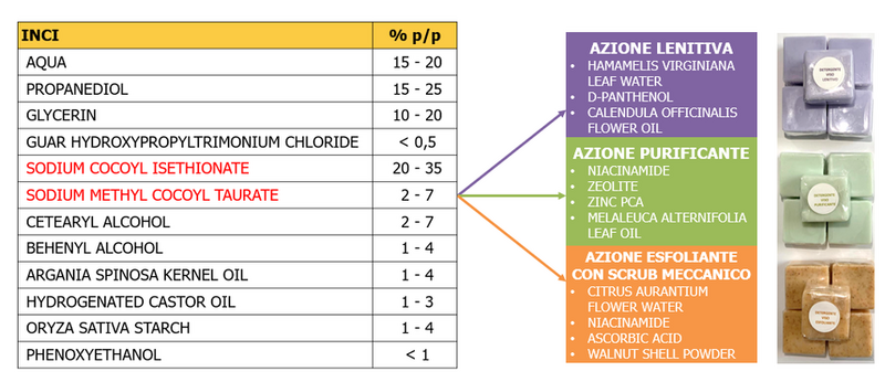 La maggior parte delle saponette solide in commercio si basa sulla combinazione di olio di palma e palmisto saponificati con soda sottoforma di miscele già pronte e lavorabili a freddo con macchinari appositi, insieme ad ingredienti accompagnanti quali: profumo, emollienti tra cui oli e burri vegetali, estratti secchi funzionali. Per la formulazione di shampoo solidi non si possono utilizzare i saponi tradizionali, a causa dell’effetto sgradevole che si percepisce quando questi precipitano a contatto con l’acqua dura del rubinetto contenente ioni bivalenti di Magnesio e Calcio, che si legano al posto del Sodio formando sali insolubili. Si ricorre quindi all’utilizzo di basi già pronte contenenti tensioattivi sintetici in polvere quali Sodium Cocoyl Isethionate con alcoli/acidi grassi o oli vegetali idrogenati, a cui si aggiungono oli/burri vegetali, profumo, estratti secchi. La realizzazione di un prodotto di questo tipo con SAL molto elevata mediante fusione e successivo colaggio risulta essere molto complessa, perché le temperature da raggiungere sono superiori a 90-95°C. Tuttavia, è possibile creare dei detergenti solidi per il corpo o per il viso con una SAL pari a circa 30, pH dermocompatibile, schiuma morbida e sensazione idratante, con il metodo per fusione e colaggio a circa 65°C (Immagine 1, Formula 4).