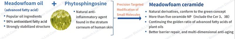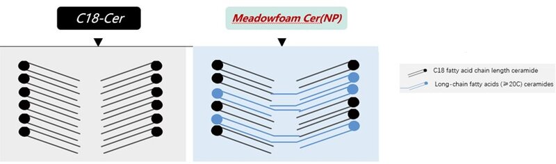 Meadowfoam Cer è in grado di formare strutture impilate tra loro, colmando la struttura a doppio strato tra i lipidi. In aggiunta, ceramidi a catena lunga migliorano l'ordinamento della struttura lamellare della membrana e rafforzano l'integrità della barriera cutanea.