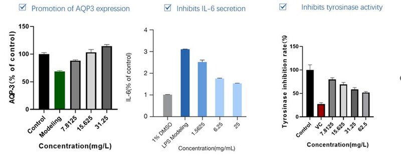 L’utilizzo di Meadowfoam Cer aumenta l’espressione di Aquoporine-3, responsabili del bilancio osmotico della pelle. Per la presenza di ceramide si riduce lo stress ossidativo delle cellule andando ad inibire IL-6, marcatore di infiammazione. Inibendo l’attività della Tyrosinase viene ridotta la produzione di melanina con conseguente attività schiarente.