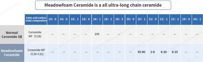 Rispetto alla classica Ceramide NP di prima generazione la Meadowfoam Cer presenta lunghezze di catene molto più lunghe, come riportato nella grafica.