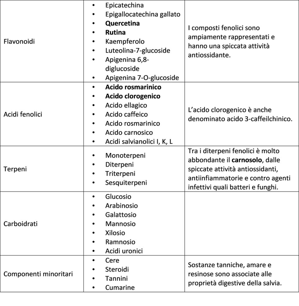 La ricchezza di principi attivi contenuti in Salvia officinalis è la chiave di volta dei numerosi utilizzi in ambito terapeutico, cosmetico e alimentare. Si annovera la presenza delle suddette specie fitochimiche (9,12-14).