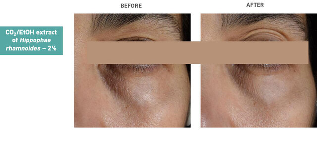 Più specificamente, l'acido ursolico, l'acido maslinico e l'acido oleanolico sono noti per i loro effetti diretti sulla microcircolazione cutanea e sulla funzione della barriera endoteliale riducendo la permeabilità vascolare indotta dall'infiammazione. È interessante notare che queste tre molecole dimostrano anche il potenziale di abbattere il pigmento rosso associato alle occhiaie, attraverso la stimolazione di HMOX-1. La loro capacità di inibire il danno ossidativo, in particolare la produzione di ROS che si accumula nella zona sub-oculare infiammata, è stata ben documentata. La presenza di questi triterpeni è stata abbondantemente descritta nelle foglie di Hippophae rhamnoides. Comunemente noto come olivello spinoso, questo albero è originario delle regioni temperato-fredde dell'Europa e dell'Asia e contiene bacche commestibili di colore arancione intenso utilizzate negli integratori nutraceutici.