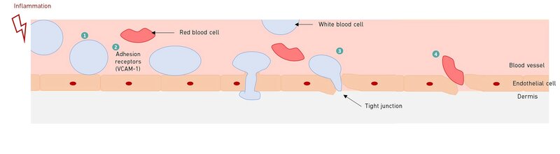 Infatti, in condizioni infiammatorie, la secrezione di mediatori pro-infiammatori stimola le cellule endoteliali e attiva i recettori di adesione, come VCAM-1. I globuli bianchi aderiscono alla membrana delle cellule endoteliali, rotolando su di essa fino a quando non colano attraverso l'apertura delle giunzioni strette. Allo stesso tempo, i globuli rossi di dimensioni più piccole fuoriescono passivamente attraverso le stesse aperture (Figura 1).