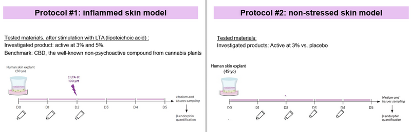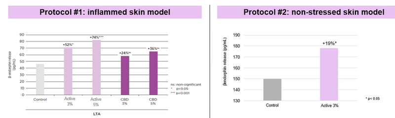 L’efficacia dell’attivo è stata valutata attraverso studi ex vivo e clinici. Lo studio ex vivo ha previsto l’allestimento di un protocollo su un modello di pelle infiammata in cui il blend è stato testato al 3 e al 5% con il benchmarck CBD, un composto ben noto derivante dalla pianta di cannabis. Il modello di pelle è stato stimolato con acido lipoteicoico.