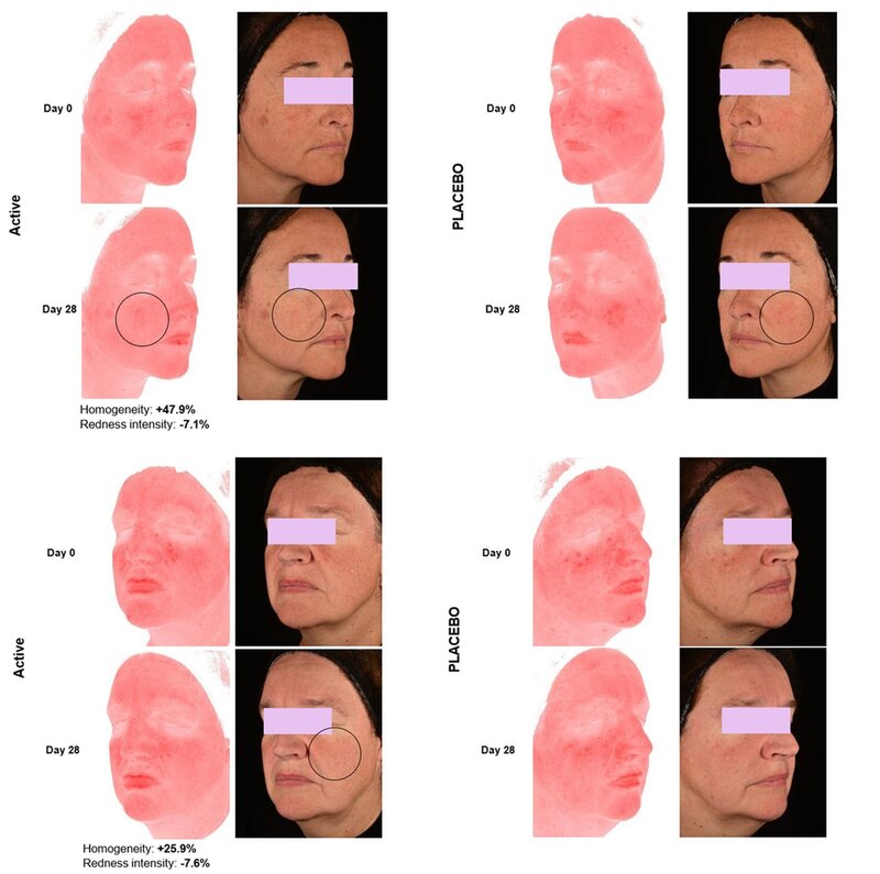 Lo studio clinico è stato condotto su un panel di 21 donne (27-65 anni) con pelle sensibile ed eritema. Il protocollo ha previsto l’applicazione del prodotto al 3% su metà viso, mentre sull’altra metà è stato applicato un placebo, per un periodo di 28 giorni. Le valutazioni sono state effettuate ai tempi T0, 7, 14 e 28 giorni, analizzando i seguenti parametri: livelli di IL-6 (analisi biochimica), rossore cutaneo (misurazione strumentale), composizione del microbiota cutaneo (analisi metagenomica 16S rRNA) e sensibilità cutanea (test di percezione soggettiva).