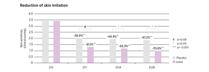 Figura 7. Risultati del blend di attivi in vivo in termini di riduzione di irritazione cutanea confrontati con il placebo.