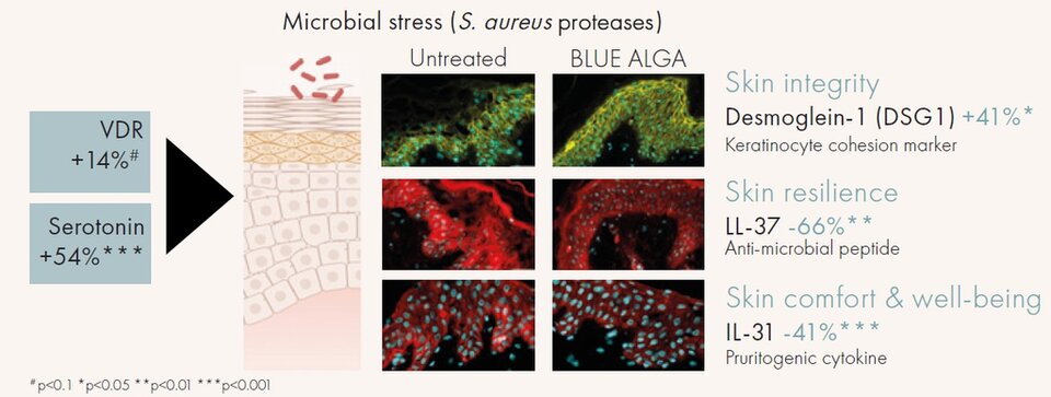 In condizioni di stress microbico, BLUE ALGA migliora la sintesi della desmogleina-1 (DSG1), una proteina adesiva desmosomiale fondamentale per la coesione dei cheratinociti e l'integrità strutturale dell'epidermide, limitando così la penetrazione delle tossine batteriche. Di conseguenza, la necessità di produrre il peptide antimicrobico LL-37 è ridotta, poiché la pelle è meglio protetta e più resistente. La risposta infiammatoria è quindi minimizzata, diminuendo la produzione della citochina pruritogena IL-31, riducendo in ultima analisi il prurito cutaneo e favorendo il comfort e il benessere.