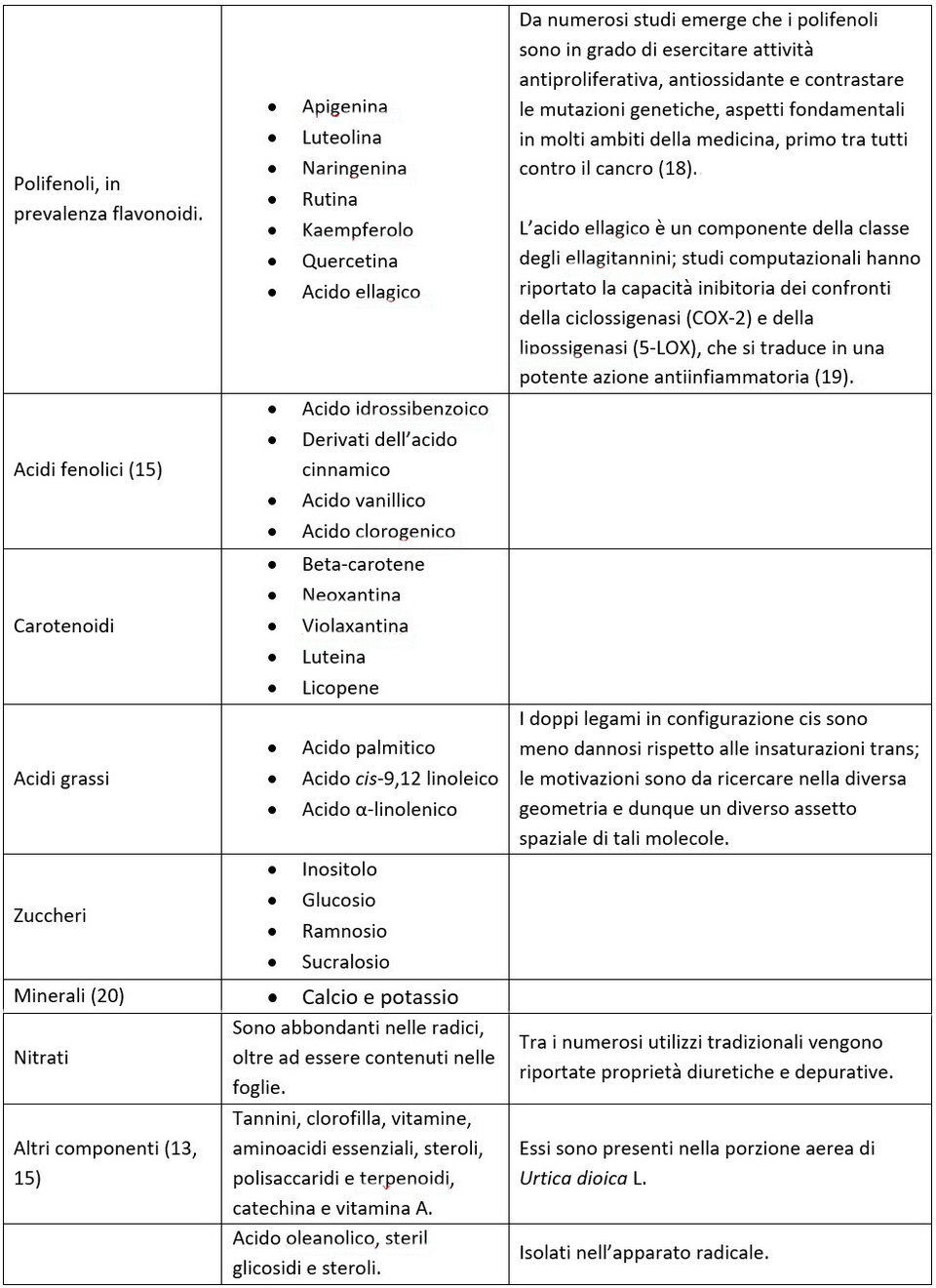 Urtica dioica L. presenta numerosi componenti, tra cui si annoverano in ordine di abbondanza i seguenti: