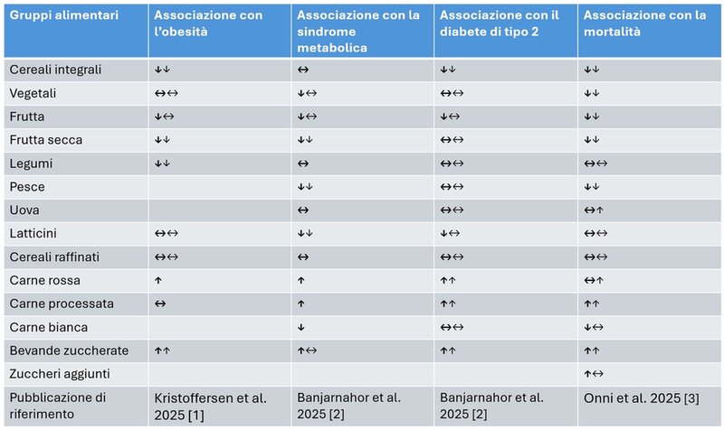 Tabella 1. Associazioni tra gruppi alimentari e rischio di malattia o mortalità per tutte le cause.