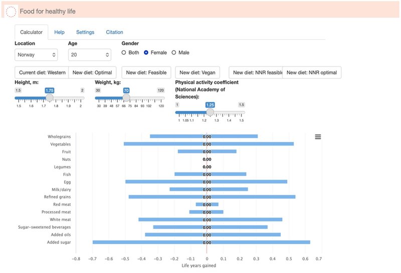 Il gruppo di ricerca del Prof. Fadnes ha sviluppato uno strumento di calcolo con un rilevante potenziale applicativo nel supportare i cittadini verso scelte alimentari più salutari. Il calcolatore Food4HealthyLife, (Figura 1), consente all’utente di inserire le proprie caratteristiche individuali (età, peso corporeo, altezza e livello di attività fisica), di descrivere il proprio regime alimentare attuale e di simulare l’adozione di un modello dietetico orientato al miglioramento dello stato di salute (6).