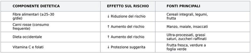 Le evidenze disponibili supportano un ruolo centrale della dieta nella gestione della diverticolosi e nella prevenzione delle complicanze. Un adeguato apporto di fibre, soprattutto da fonti vegetali integrali, si associa a riduzione del rischio di diverticolite e ospedalizzazione, mentre un consumo elevato di carni rosse e un pattern occidentale risultano correlati a maggiore probabilità di eventi acuti (4, 8).