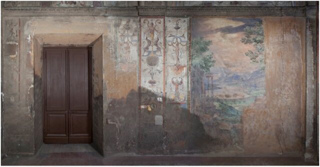 Forse uno dei primi casi che ci ha visto intervenire su una problematica particolarmente difficile: uno spesso strato di caseina, stesa sopra i dipinti murali come protettivo ma cristallizzata nel tempo, combinata con patine di sali (gesso, carbonati e fosfati) che rendevano ancora più complessa la pulitura. Queste patine coprivano un ciclo di dipinti murali nelle due logge esterne dell’edificio, risalenti alla metà del XVI secolo e raffiguranti soggetti a grottesche e due episodi del mito di Ercole e Caco, interpretati come una metafora politica di eventi contemporanei all’epoca della loro realizzazione. L’ingresso e un ampio paesaggio — che costituisce oggi l’unico elemento ancora visibile delle pitture murali nella loggia inferiore — occupano le pareti lunghe delle due logge. Sono proprio queste porzioni della loggia inferiore ad essere state interessate dalle prove di biopulitura (Figura 1).