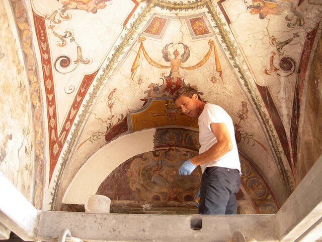Figura 2. Franco Adamo durante i lavori di restauro dei dipinti murali di Casina Farnese.