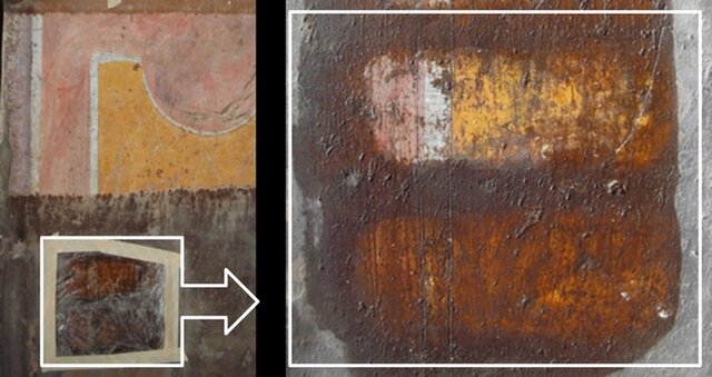 Nella Figura 3 è possibile osservare l’effetto di un trattamento di biopulitura realizzato con un impacco contenente batteri Pseudomonas koreensis UT30, applicato per 24 ore su una porzione della parete dipinta. Il risultato viene messo a confronto con quello ottenuto utilizzando esclusivamente il supportante in gel, una laponite al 9%, priva di microrganismi.