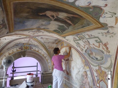 Adele Cecchini durante il restauro dei dipinti murali della loggia superiore.